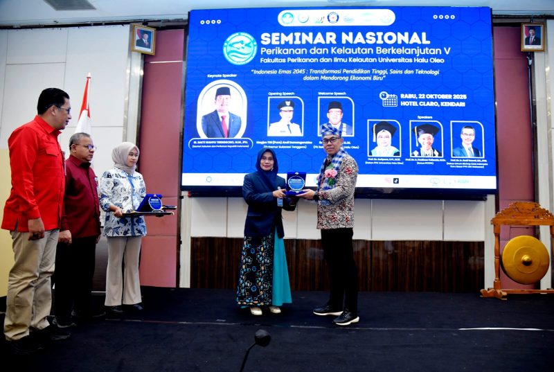 Potretterkin.id, KENDARI- Fakultas Perikanan dan Ilmu Kelautan (FPIK) Universitas Halu Oleo sukses menyelenggarakan Seminar Nasional Perikanan Berkelanjutan V dengan tema “Transformasi Pendidikan Tinggi, Sains, dan Teknologi dalam Mendorong Ekonomi Biru Menuju Indonesia Emas 2045” bertempat di Claro Hotel Kendari.